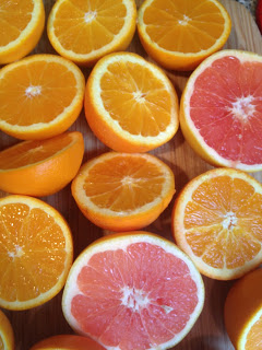 5 oranges, 4 juiced, and 1 whole, peeled orange