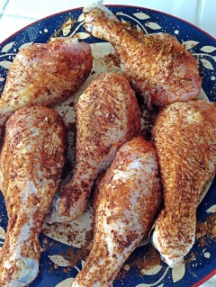 Preheat the oven to 375F. Generously season chicken legs with sea salt , then sprinkle with Berbere spice and pat the mixture in.