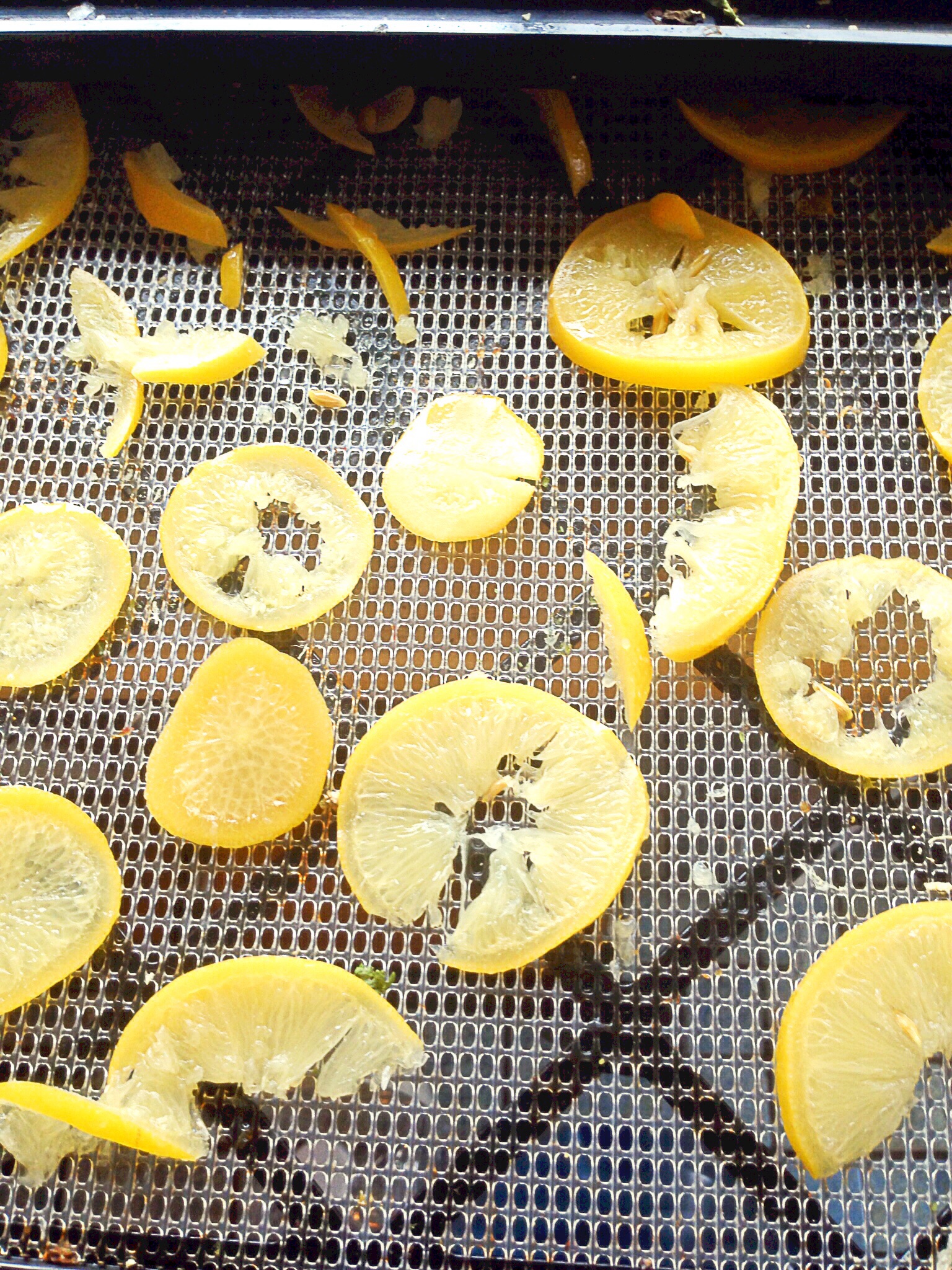 Directions: Pre-heat oven to 150F if using an oven.  If using a dehydrator set it to 135F. Place preserved lemon slices evenly onto your dehydrator sheets, if using a stove,  spread over a wire rack set inside of a bake sheet.