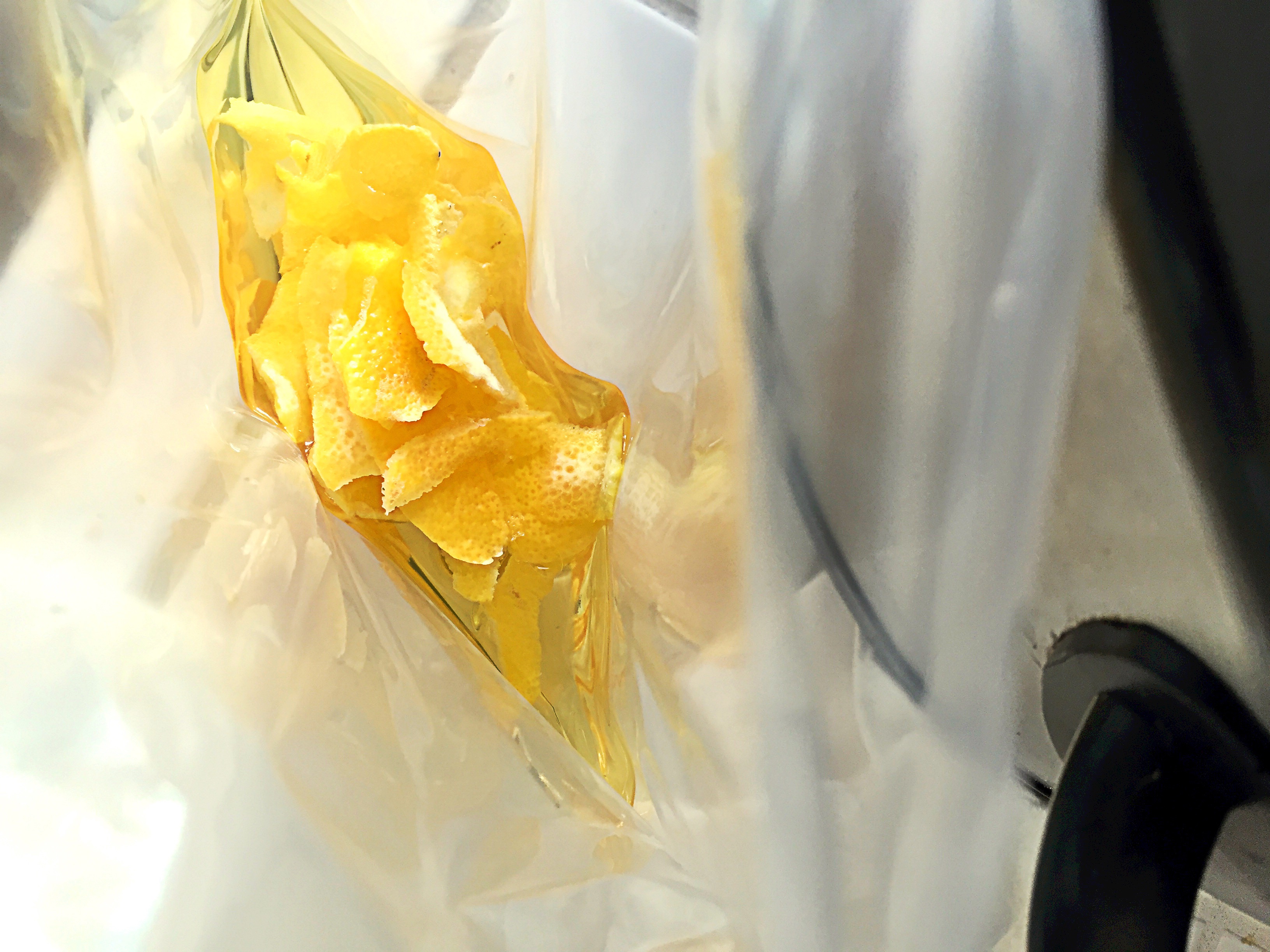 Directions for Sous vide:  Fill a pot or container with water, then set the circulator to 131F and wait for the water to come to temperature. Meanwhile add the oil and lemon peels to a bag–making sure to bend and twist them to release oils.
