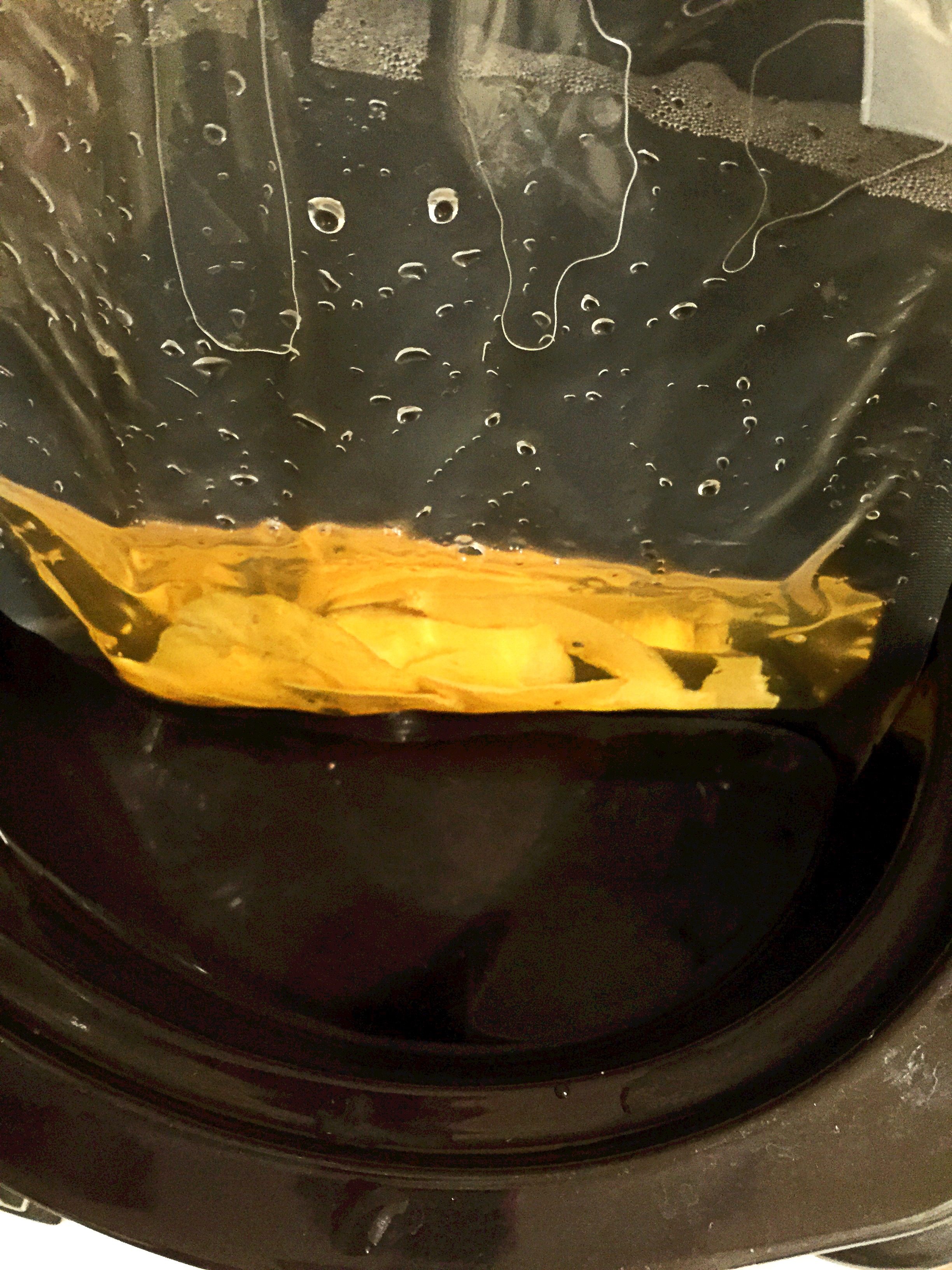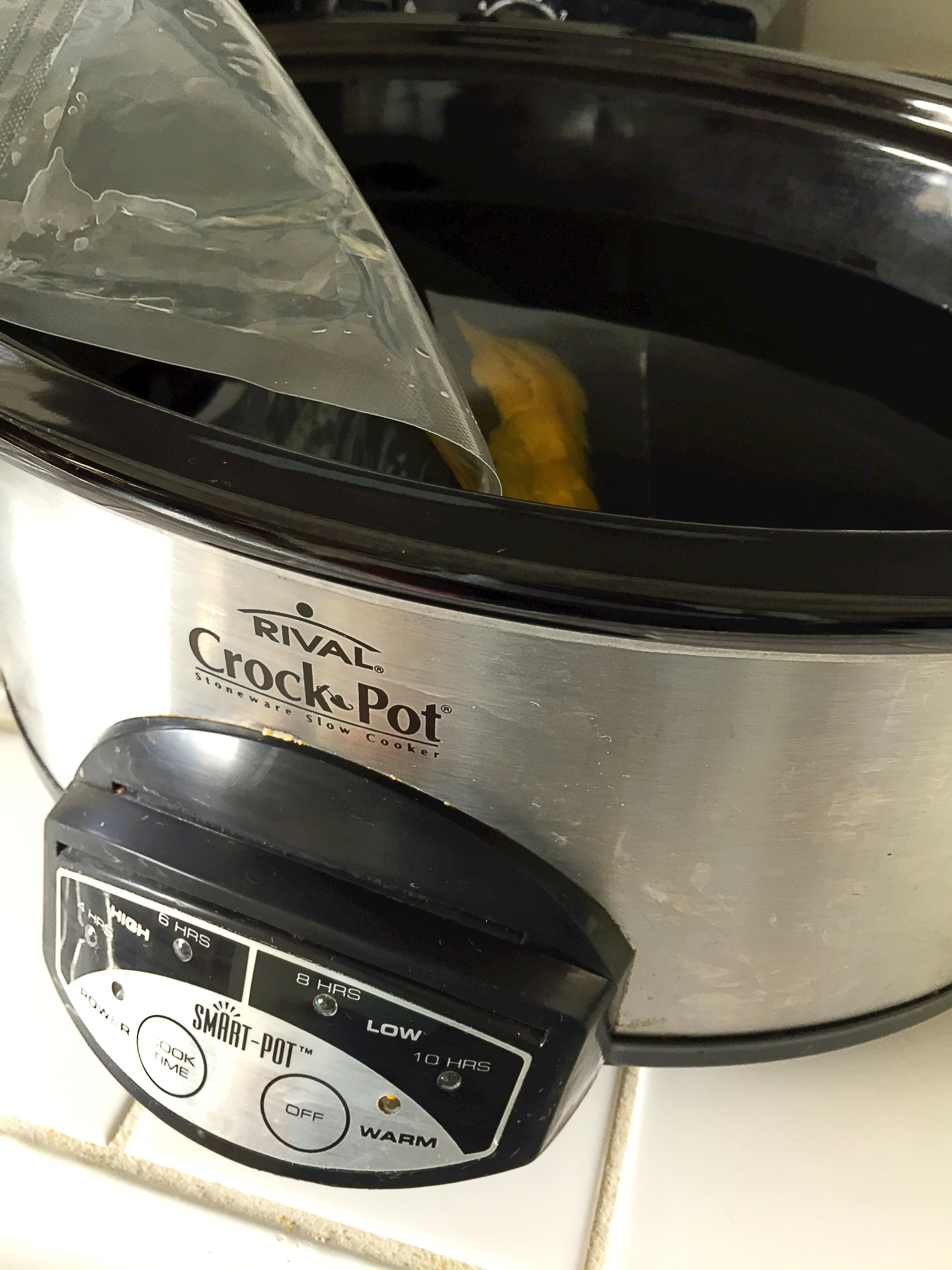 If you’re using a ziploc bag place the bag in the slow cooker and seal using the water displacement method, then cook for 3 hours.  If you have a vacuum chamber sealer that allows you to seal liquids like I do, then seal the oil and lemon mixture in a bag for 10 seconds with a 1.5 second seal.