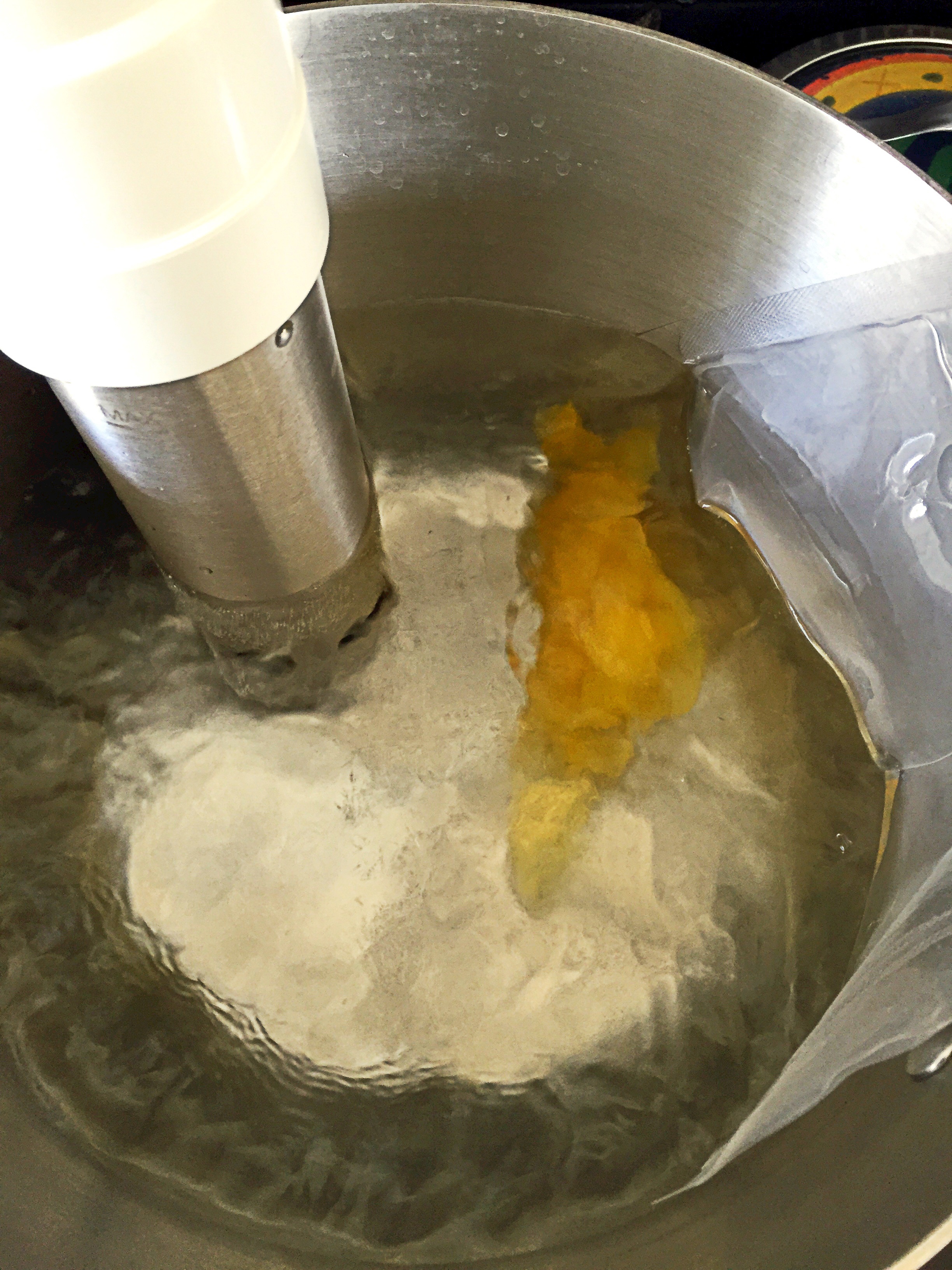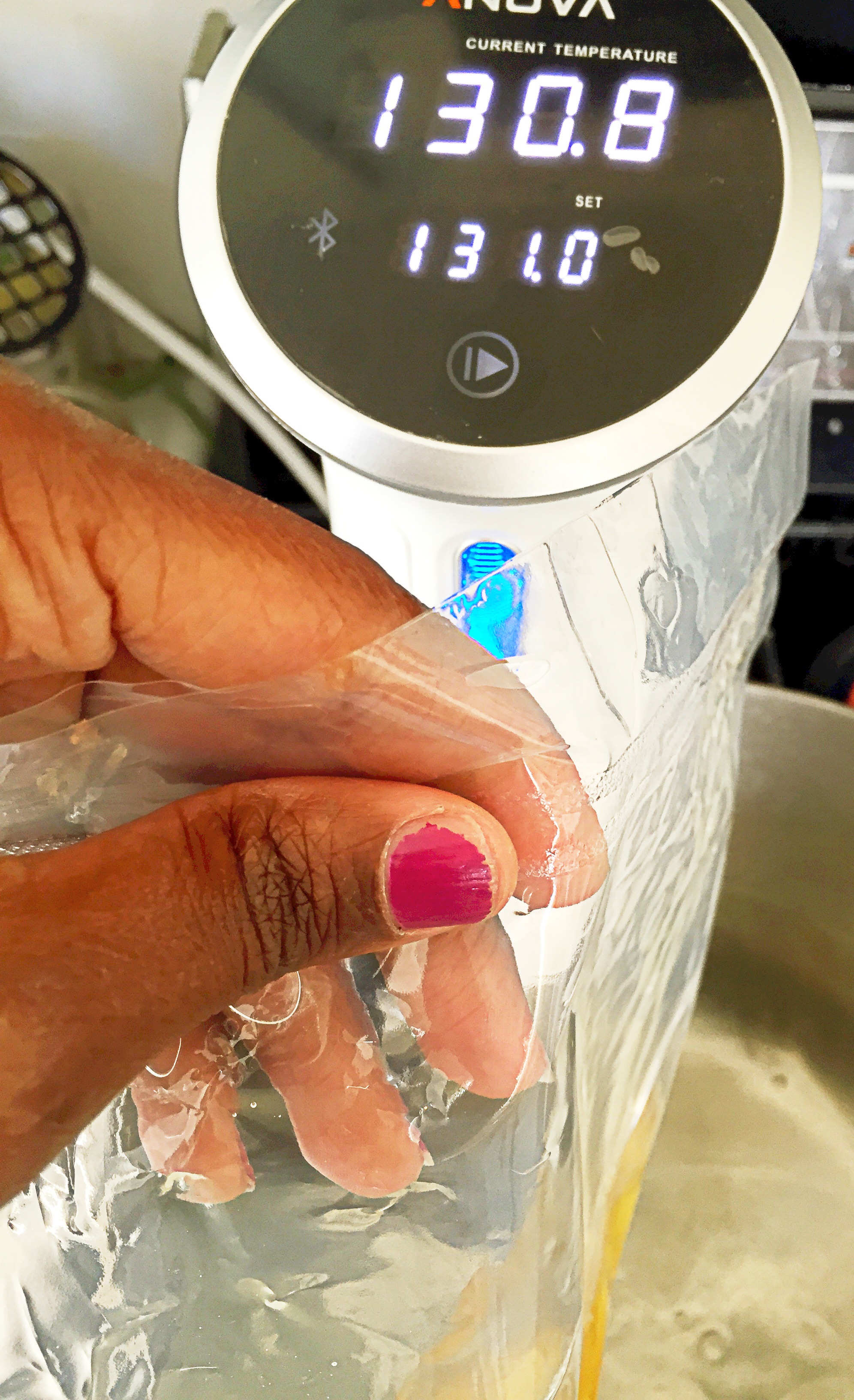If you’re using a ziploc bag place the bag in the water bath and seal using the water displacement method, then cook for 3 hours.  If you have a vacuum chamber sealer that allows you to seal liquids like I do, then seal the oil and lemon mixture in a bag for 10 seconds with a 1.5 second seal.