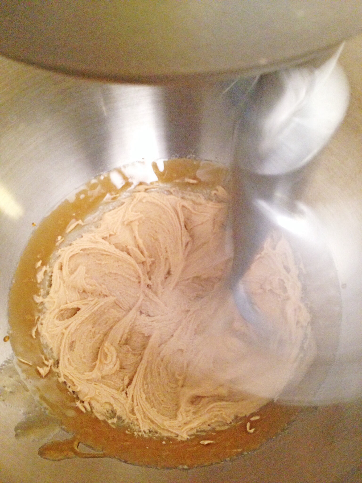Remove from heat and pour into stand mixer fitted with the paddle attachment. Turn the mixer on medium speed (about 6) and mix.