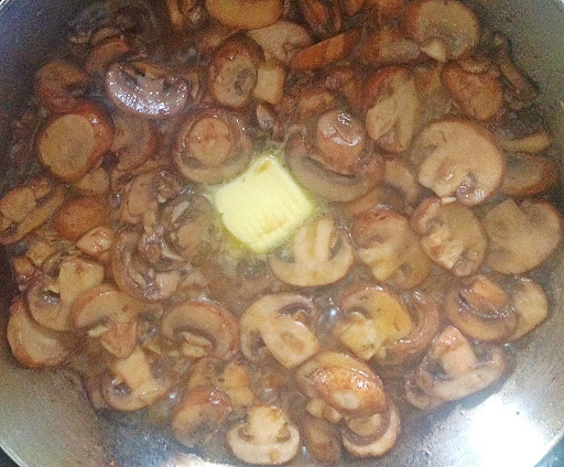 Salt the mushrooms and allow to cook until just before the water from the mushrooms evaporates(5-7 minutes). Add in the tab of butter, and allow the mushrooms to brown and take on a bit of color. This step is important don’t skip it! Browning releases Unami flavor.