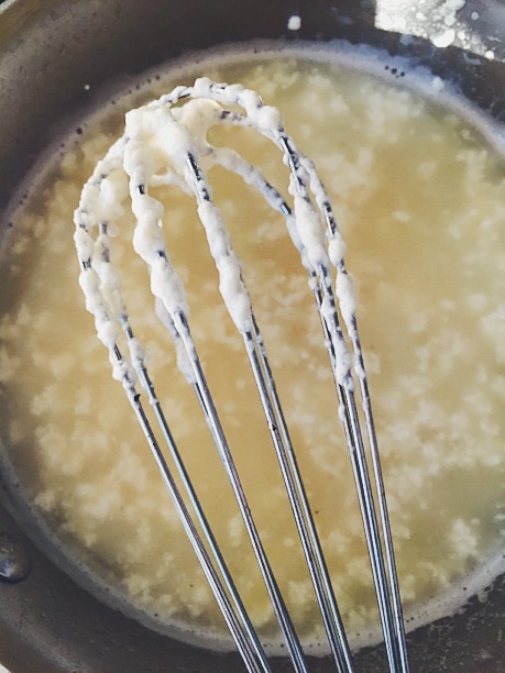 Once the sugar completely dissolves, slowly add the cream mixture, be careful the mixture will boil violently:
