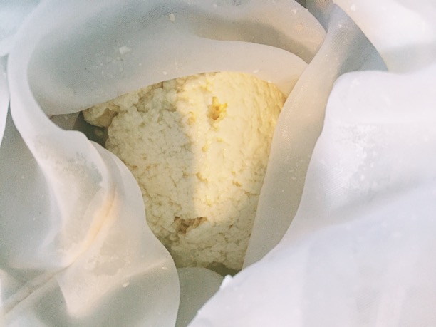 From here you can decide to just strain the mixture in a cheesecloth lined sieve, add salt to taste and be done–you’ll have a perfectly soft crumble cheese.