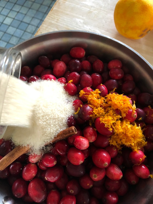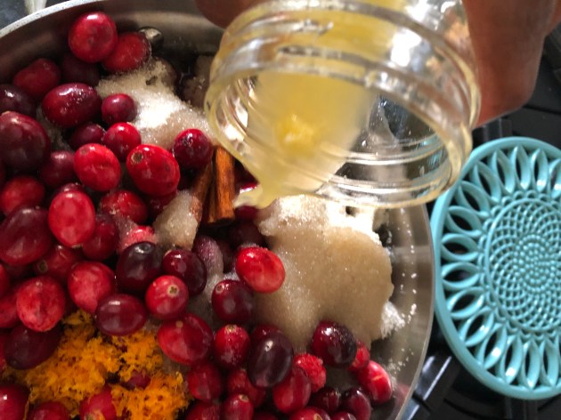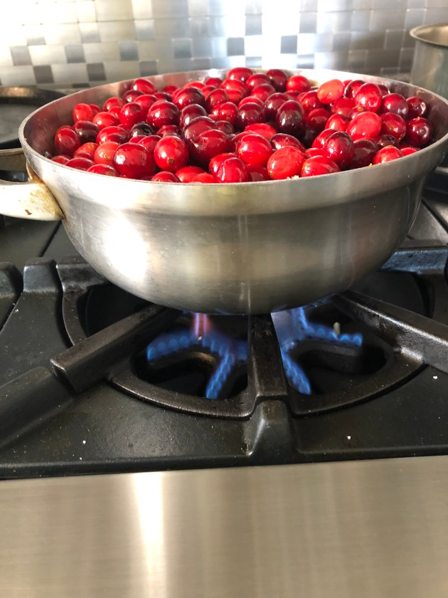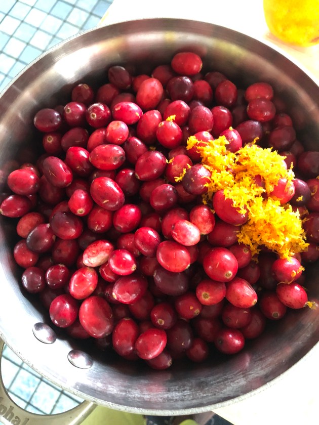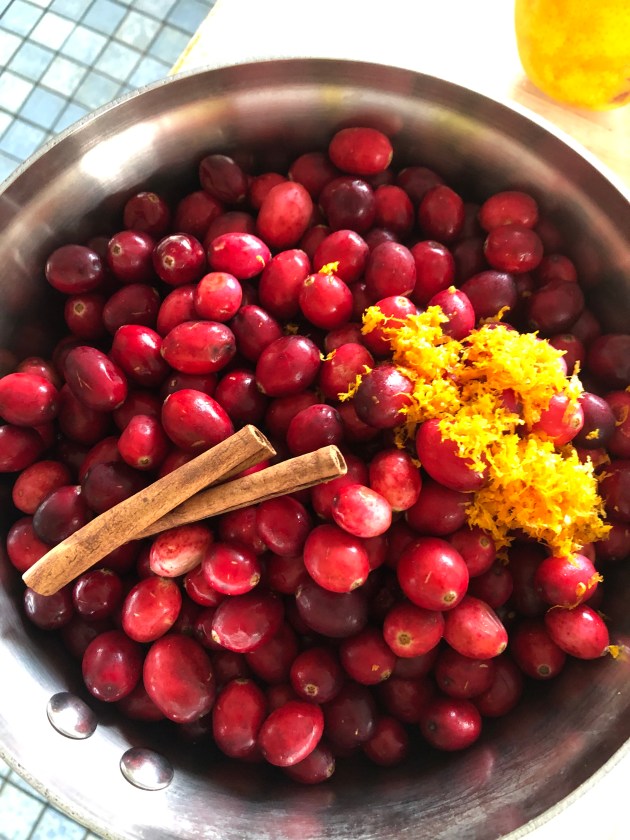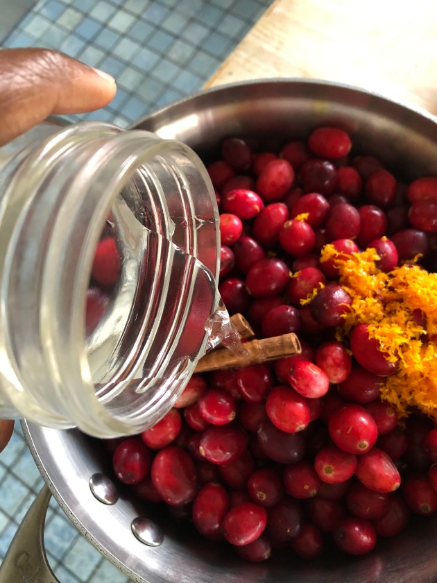 If you’ve been following me on Instagram you know that I’ve been busy preparing for Thanksgiving and Page’s Birthday right after. We are hosting Thanksgiving , which means that I will be doing most of the cooking. I spent most of the day writing out my menu, dividing up tasks I can accomplish throughout the next few days. Today I tackled prepping my desserts which just means I weighed the dry ingredients put them in bags, labeled, and sealed them. Now all I have to do is add the wet ingredients and bake. As you can see I’ve learned over the years that cooking a large meal like this requires a lot of forethought and staggering of duties. So today one of the other things on my to do list was to make this cranberry sauce! It takes 10 minutes, you throw everything in one pot, a little bit of stirring and you’re done! So easy and super delicious and definitely an upgrade to the canned stuff. Trust me once you make this you will never go back to the canned stuff!